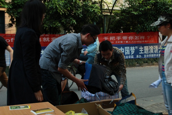 趁着午饭时间,“爱心衣连衣,情暖你我他”于中午11点半开工啦!1008班的“志愿者”们各显本领,或大声吆喝,或散发宣传单,或给不认识的同学详细介绍活动情况,或招呼认识的同学速速“抱”来他们的爱心……或许是很多同学中午时间比较匆忙的原因,中午的活动收获并不十分显著,但有很多热心的同学表示对活动感兴趣,晚上会送衣服过来。
