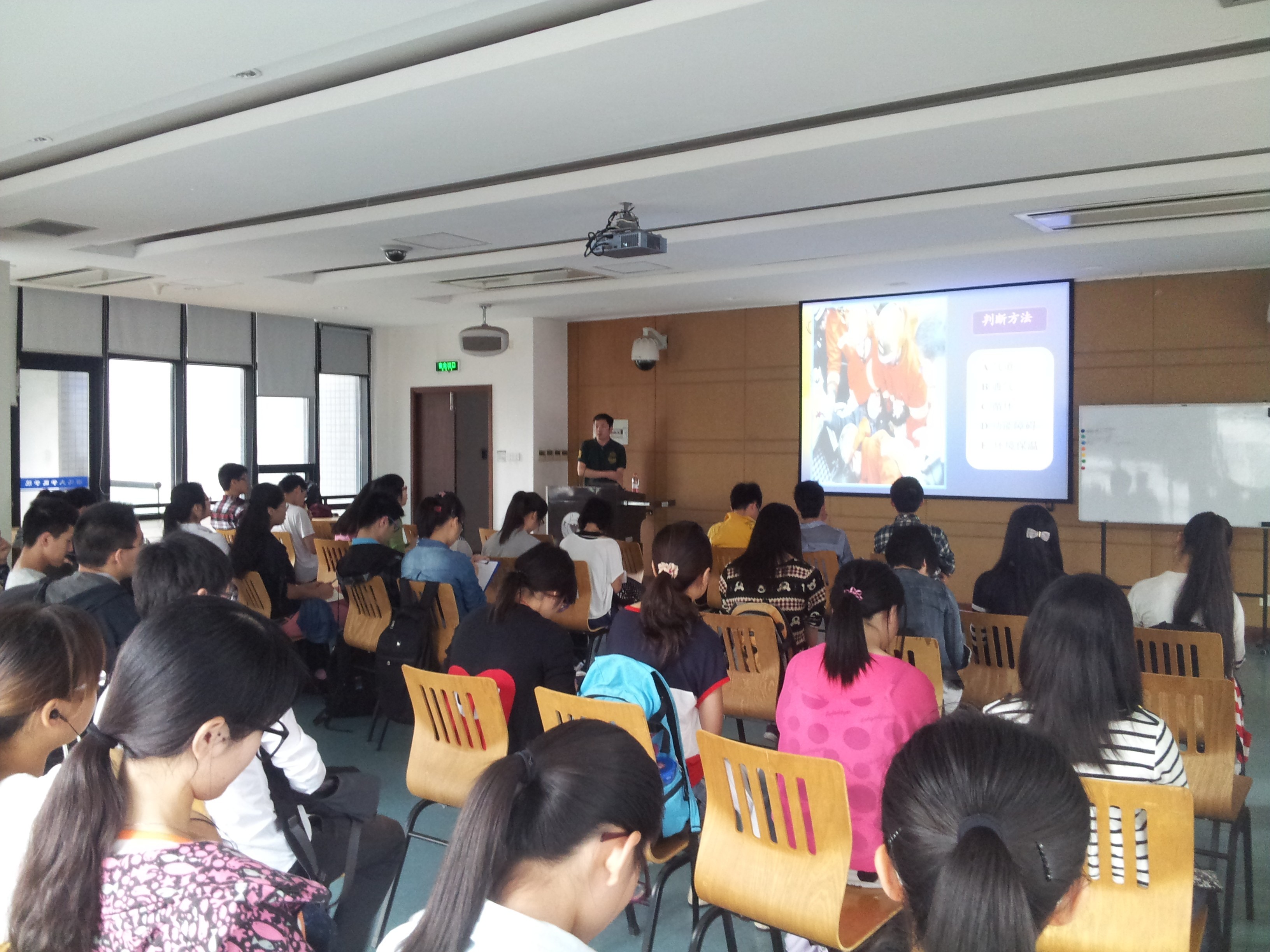 此次培训主要讲述了遇险环境的评估和遇险的处理应对策略,以及抢救及时的重要性。之后还对急救步骤做了个详细地罗列。经过了一个多小时的讲解,同学们对院前急救都有了深刻地了解。最后,培训还进行了模拟操作示范以及胸部按压的练习。