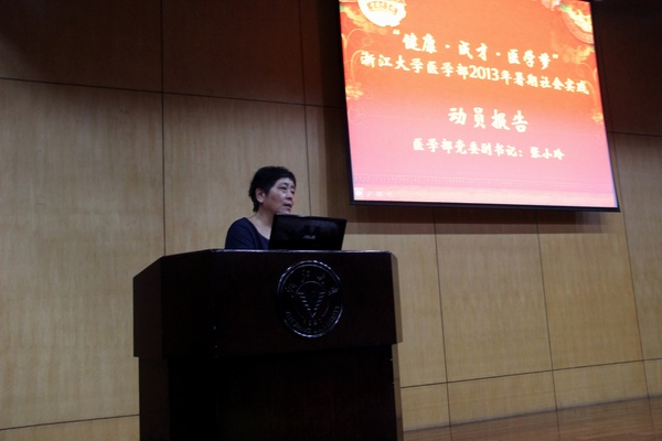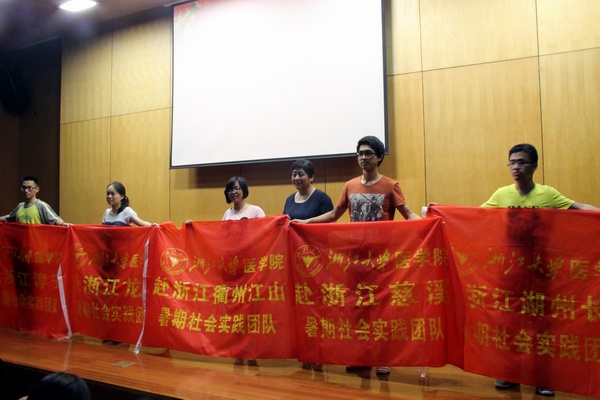 医学院党委副书记张小玲老师在动员报告中强调了社会实践对医学生的重要意义和作用,指出社会实践是深入了解社会和锻炼大学生社会技能的重要途径,希望每位同学能够明确社会实践的重要性,认真对待社会实践。最后由张小玲老师、王恩禹老师、陈超老师为医学院2013年暑期社会实践的校、院两级重点、一般团队进行了授旗。