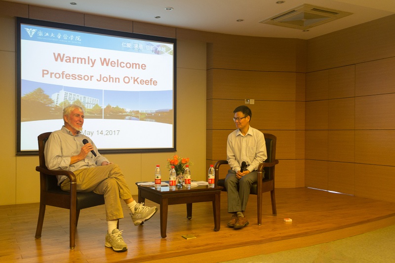 2017年5月14日上午,与诺奖学者面对面——交流座谈会在浙江大学紫金港校区医学院综合楼成功举行。本次座谈会主讲嘉宾是2014年诺贝尔奖生理学或医学奖获得者,伦敦大学学院神经回路和行为塞恩斯伯里康中心主任John O’Keefe教授。座谈会由医学院赵经纬教授主持。
