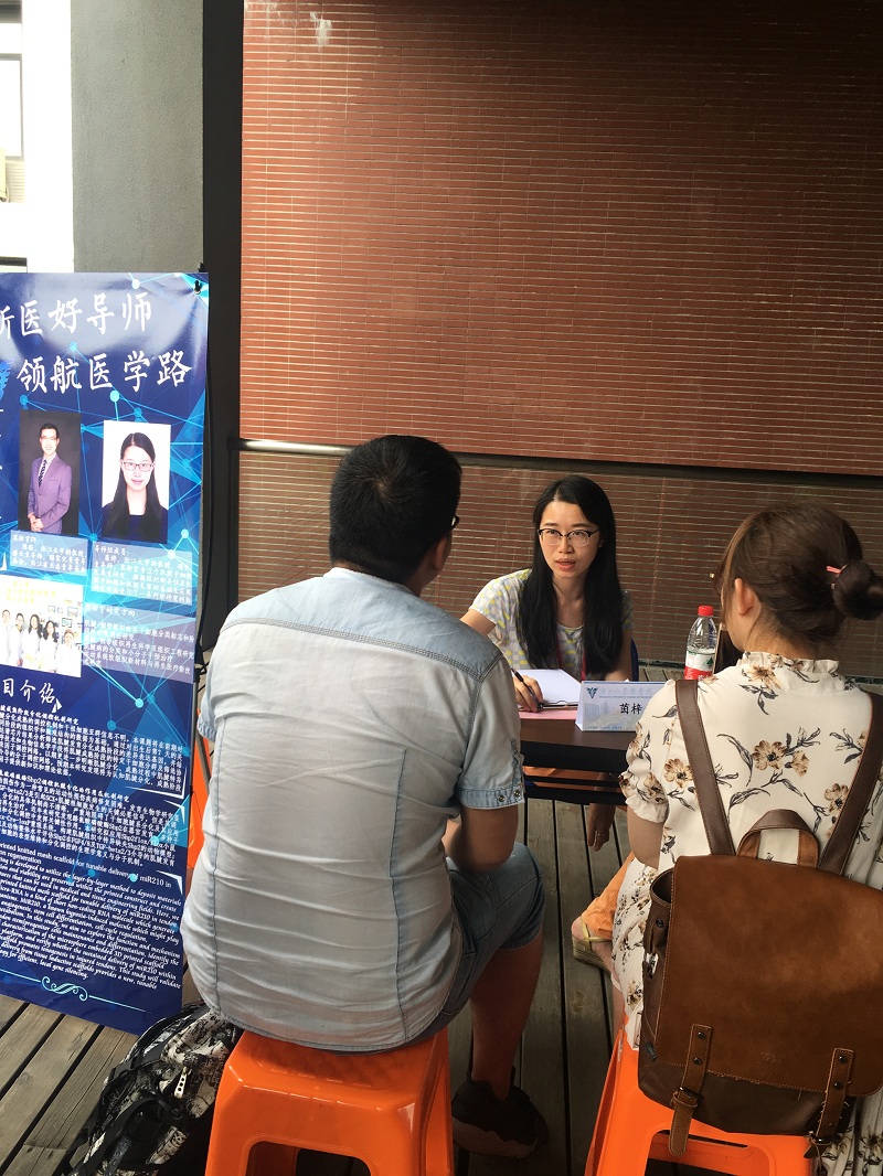 在自由面试环节,各个导师团队在医学院辅楼报告厅外或各自实验室对学生进行现场交流和面试招聘,整个场面非常热闹,同学们积极性很高,导师的桌子前排起长龙。